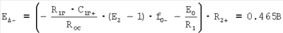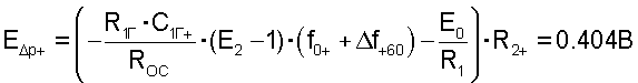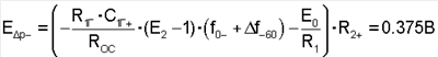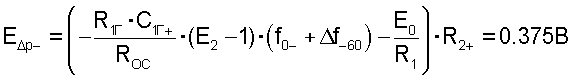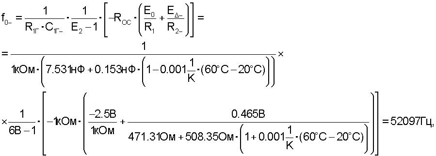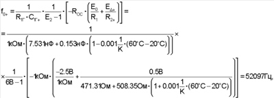 Пусть величины сопротивлений ROC=R1=R2=1 кОм. Предположим, что выходное напряжение с детектора составляет -E +=0.5 В (величина выходного напряжения зависит от схемной реализации детектора, выходное напряжение которого пропорционально амплитуде входного напряжения). Тогда требуемое значение напряжения Е0 в соответствии с последним выражением равно минус 2.5 В для получения управляющего напряжения E1=2 В. Для получения частоты генератора 53019 Гц при минимальной рабочей температуре величина выходного напряжения с детектора должна быть равна .