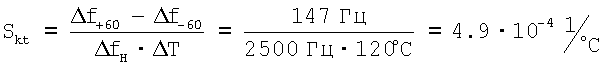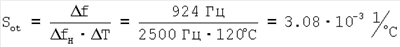 Если принять девиацию частоты собственных колебаний вибрирующего элемента от измеряемого параметра (например, давления величиной 3 атм) fH=2500 Гц, то приведенная дополнительная аддитивная температурная погрешность составит ,