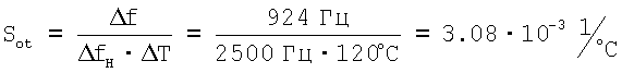 – девиация начальной частоты собственных колебаний f в диапазоне температур T=120°C составила 924 Гц;