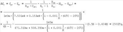 Для рассматриваемого случая система уравнений (14) имеет решение при положительном ТКС  и отрицательном ТКЕ  . Предположим, что при изготовлении ТКС  получился равным 0.001 1/К, а ТКЕ  равным минус 0.001 1/К, что может быть получено на практике. Тогда требуемые значения сопротивлений в соответствии с системой уравнений (14) R =508.35 Ом (при нормальной температуре), R2Н 471.31 Ом и емкостей С =0.153 нФ (при нормальной температуре), С1ГН=7.531нФ.