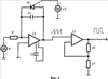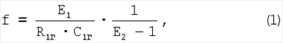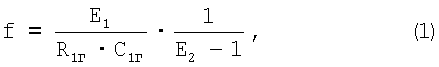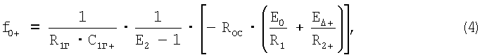 Возбуждение колебаний вибрирующего элемента производится путем подачи сигнала с генератора на электрод возбуждения. Чаще всего используется синусоидальный сигнал, но в силу инерционности вибрирующего элемента может использоваться и сигнал в виде прямоугольных импульсов. Пример генератора прямоугольных импульсов, управляемого напряжением, приведен на фиг.4, который реализован на двух операционных усилителях типа LM301. Функция преобразования этого генератора, дающая связь частоты генерации f с управляющим напряжением E1, имеет вид: