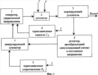 На фиг.1 приведена структурная схема преобразователя: 7 – генератор, управляемый напряжением, 2 – вибрирующий элемент (резонатор), 3 – нормирующий усилитель, 4 – детектор, преобразующий синусоидальный сигнал в постоянное напряжение, 5 – термозависимое сопротивление R для компенсации мультипликативной температурной погрешности, 6 – термозависимая емкость С для компенсации аддитивной температурной погрешности, 7 – инвертирующий сумматор, Т – внешний воздействующий фактор – температура, Р – измеряемый параметр, например давление. Выход преобразователя представляет собой синусоидальный сигнал, девиация частоты которого соответствует девиации частоты колебаний вибрирующего элемента 2 от измеряемого параметра Р.