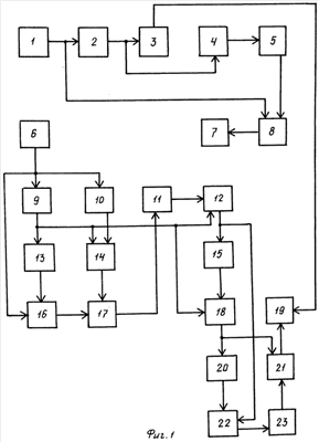 Благодаря выделению этих сигналов происходит определение дальностей для каждого из двух объектов, расположенных на разных дальностях но сигналы, от которых наложены друг на друга. Таким образом, устраняется неоднозначность определения дальности. Для выделения передней части сигнала, сигнал с приемника 6 поступает через инвертор 9, шестую линию задержки 13 на первый вход седьмого элемента совпадения 16, на второй вход которого поступает сигнал с приемника 6. Величина шестой линии задержки 13 равна длительности импульса, поступающего с выхода элемента совпадения 16 на первый вход элемента ИЛИ 17. При выделении задней части сигнала, сигнал с приемника 6 поступает через пятую линию задержки 10 на первый вход шестого элемента совпадения 14, имеющего второй вход, соединенный с выходом вышеупомянутого инвертора 9. Величина пятой линии задержки 10 равна длительности импульса, поступающего с выхода шестого элемента совпадения 14 на второй вход элемента ИЛИ 17. Таким образом, с выхода элемента ИЛИ 17 последовательно поступают два импульса, следующие друг за другом. В момент отсутствия очередного импульса с элемента ИЛИ 17 сработает второй элемент совпадения 12, на первый вход которого подается задержанный первой линией задержки 11 импульс, а второй соединен через инвертор 9 с выходом приемника 6. Величина первой линии задержки 11, а также второй линией задержек 15 равна периоду следования импульсов в пачке. Поэтому в случае отсутствия второго импульса на выходе второго элемента совпадения 12 будет иметь место положительный сигнал, который через вторую линию задержки 15 поступает на первый вход третьего элемента совпадения 18, у которого второй вход также соединен через инвертор 9 с выходом приемника 6. Следовательно, третий элемент совпадения 18 сработает при повторном отсутствии импульса, что имеет место при отсутствии двух следующих друг за другом импульсов с интервалом, равным периоду их следования. С выхода третьего элемента совпадения 18 импульс задерживается с помощью третьей линии задержки, равной времени следования пачки 20 и поступает на второй вход четвертого элемента совпадения 22, который работает только в случае поступления на первый вход импульса с выхода второго элемента совпадения 12 и выдаст импульс, далее следующий через четвертую линию задержки 23 на второй вход пятого элемента совпадения 21. Следовательно, элемент совпадения 21 работает при отсутствии двух импульсов между первой и второй пачками, что исключает ложное срабатывание и выдает импульс окончания отсчета в преобразователь дальности 19. Преобразователь дальности определяет временное рассогласование между запускающим импульсом с дешифратора 3 и импульсом с выхода пятого элемента совпадения 21. Также, как и в главном аналоге, дальность характеризуется величиной временного рассогласования между второй точкой интервала после излучения пачки импульсов, облучающих объект и точкой «d» после прихода и обработки второй отраженной пачки. При этом разность между длительностью импульса с приемника 6 и длительностью укороченного импульса с выхода элемента ИЛИ 17, после обучения точечного воздушного или космического объекта, имеет постоянное значение, что не влияет на уменьшенные точности определения дальности. Пример исполнения преобразователя дальности представлен, напр