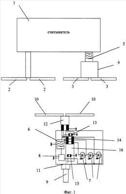 Система работает следующим образом. Считыватель 1 посылает через антенну 2 одновременно опросный радиоимпульс с несущей f0 и запускающий радиоимпульс с несущей f0i. Эти импульсы, принятые антенной 10 радиочастотной идентификационной метки, поступают на ПФ 6 и на сток (исток) ПТсИК 7. Так как транзистор 7 со встроенным каналом, то без открывающего напряжения, подаваемого на затвор, он остается закрытым, и опросный импульс не проходит на ПРИМ на ПАВ, так как ВШП ВШСНО 14 оказываются замкнутыми и ПАВ, которые падают на него от ВШП 13, преобразующего в ПАВ опросный радиоимпульс, не переводятся в другой акустический канал и не попадают на ВШП 15, соединенный с ПРИМ 9. ПФ 6 всех меток настроены на частоты запускающих импульсов. Поэтому в метке, где ПФ настроен на f0i, запускающий импульс проходит на выпрямитель 8, где формируется запирающие транзисторы 7 импульсы. Они закрываются, и опросный импульс может пройти на ПРИМ 9 на ПАВ через ЛЗ 16, так как ВШП ВШСНО 14 оказываются разомкнутыми ПТсВК 7. В этом случае опросный импульс преобразуется в ПАВ с помощью ВШП 13, подсоединенного к антенне, и принимается ВШП 15, подсоединенным к ПРИМ, так как ВШСНО переводит ПАВ из одного акустического канала в другой. Периоды ВШП 13 и 15 выбраны из условия акустического синхронизма f0=кVПАВ/ , где VПАВ – скорость ПАВ, , – периоды ВШП, к=1, 2, 3… Длительность запускающего импульса выбирается такой, чтобы сформированная опросным импульсом кодовая последовательность в ПРИМ 9 на ПАВ успела бы передаться полностью на считыватель.