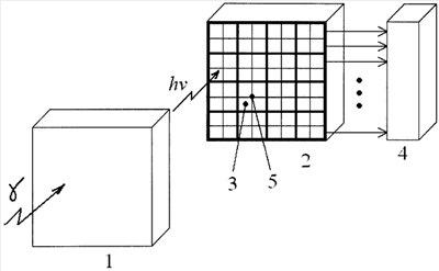 Устройство работает следующим образом. Гамма-частица, попавшая в сцинтилятор 1, вызывает в нем излучение световых квантов с интенсивностью, пропорциональной энергии частицы. Световые кванты непосредственно или через объектив попадают на матрицу лавинных фотодиодов 2. Каждый квант вызывает импульс фототока в фотодиоде и соответственно стандартизованный импульс напряжения на выходе схемы считывания матрицы. Длительность импульсов соответствует элементарному интервалу времени (например, 1 мкс). Информация о наличии или отсутствии импульсов фототока у всех фотодиодов матрицы на элементарном интервале времени передается схемой считывания в анализатор 3. Анализатор в зависимости от текущих значений средней частоты импульсов, вызванных квантовым потоком сигнала, и средней частоты темновых импульсов устанавливает размер групп 5 и количество фотодиодов, в которых анализатор оставляет значения, соответствующие наличию импульсов, по критерию совпадения, т.е. только при наличии импульсов на элементарном интервале времени во всех фотодиодах заданного количества с заданными координатами в составе группы 5. Отсутствие хотя бы одного импульса в этой комбинации переводит данную комбинацию в пустое состояние. Эта процедура повторяется во всех комбинациях из k фотодиодов всех групп с N фотодиодами в каждой группе на всех элементарных интервалах на протяжении заданного времени наблюдения.