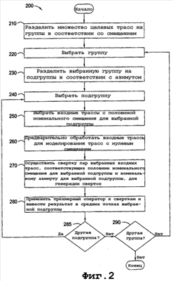 На этапе 260 выбранные входные трассы подвергаются предварительной обработке для моделирования трасс с нулевым смещением. Выбранные входные трассы можно подвергать предварительной обработке различными способами, известными из уровня техники, например способом кинематической поправки, полной миграции/демиграции и т.п. Входные трассы могут размещаться в своих средних точках. Таким образом, каждая предварительно обработанная входная трасса моделирует трассу, которая была бы записана, если бы источник и приемник располагались в средней точке.
