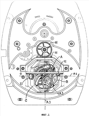 Каркас А, содержащий баланс 1, анкерное колесо 2 и триб 3 анкерного колеса, поворачивается вокруг оси А1, в то время как каркасы В и С поворачиваются вокруг их осей А2 и А3, при этом три оси А1, А2 и А3 перпендикулярны друг другу.