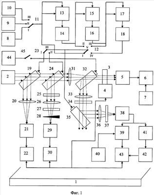 Для измерения фазы i-й частотной составляющей i на цифровом фазометре 39 подаются сигнал опорной частоты от опорного генератора 40 и полезная мощность с выхода фотопреобразователя 38. Цифровой фазометр 39 обеспечивает измерение фазы i-й частотной составляющей за период частоты f. Измеренные амплитуда и фаза каждой спектральной составляющей фиксируются осциллографом 43.