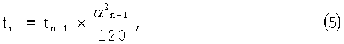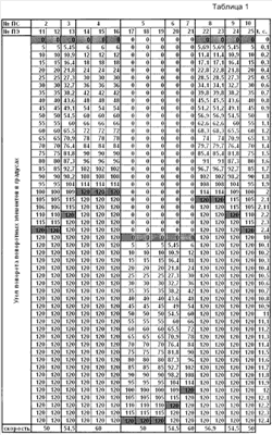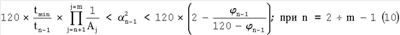 Во второй группе назначают выбранным первым крайним приводным средством ПС 6 с присвоением ему номера n=1, для которого длительность подачи сигналов первого типа задают равным также 2,4 сек. Для второго крайнего приводного средства второй группы ПС 10 длительность подачи сигналов первого типа задают равным 1,95 сек. Для ПС 6 – ПС 10 скорость вращения и длительность подачи сигналов первого типа рассчитывают согласно формулам (4) и (12) соответственно, а угол поворота ( ) поворотных элементов, начиная с приводного ПС 7 (n=2) по ПС 10 (n=5) выбран из заранее определенного диапазона согласно условиям (14) и (15).