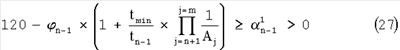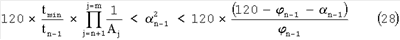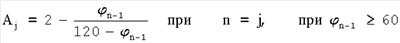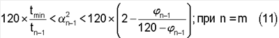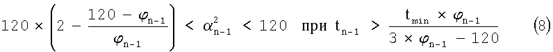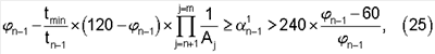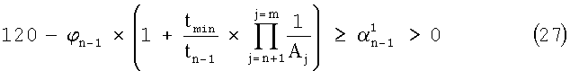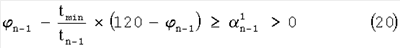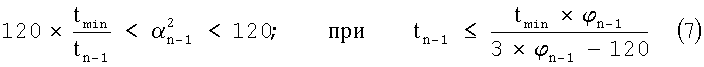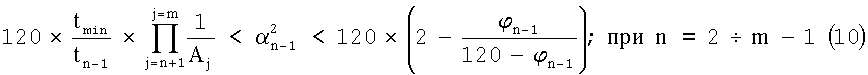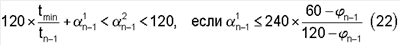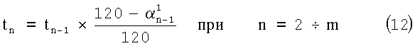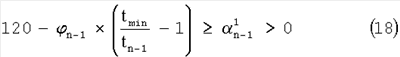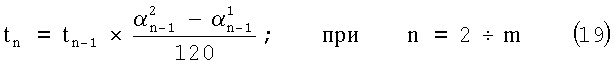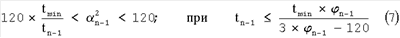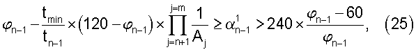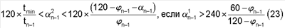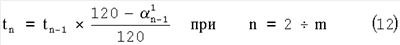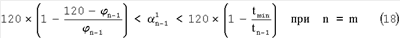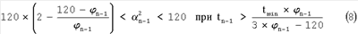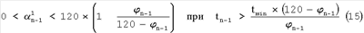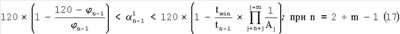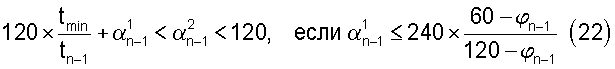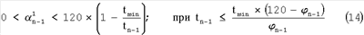 Для ПС первой группы скорость вращения и длительность подачи сигналов первого типа рассчитывают согласно формулам (4) и (5) соответственно, при этом последовательно задают угол поворота( ) поворотных элементов, начиная с ПС 3 (n=2) приводного средства по ПС 4 выбирая его из заранее определенного диапазона согласно условию (6).