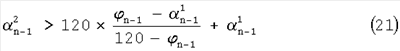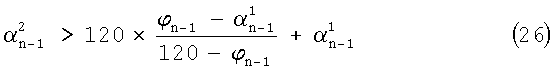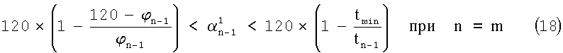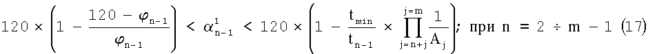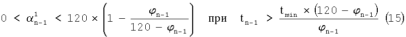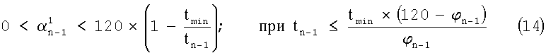 В случае, когда первый выбранный угол имеет значение меньше параметрического угла , а второй выбранный угол имеет значение больше (120- )°, в каждой паре поворотных элементов, связанных с различными приводными средствами, при совпадении направления вращения поворотных элементов с направлением последовательности подачи сигналов первого типа, угол поворота поворотного элемента, связанного с предыдущим по подаче сигнала приводным средством, должен превышать соответствующий параметрический угол в момент поворота поворотного элемента, связанного с последующим по подаче сигнала приводным средством на угол (120- )°, а при не совпадающем направлении вращения поворотных элементов с направлением последовательности подачи сигналов первого типа, угол поворота поворотного элемента, связанного с предыдущим по подаче сигнала приводным средством должен быть меньше, чем угол (120- )° в момент поворота поворотного элемента, связанного с последующим по подаче сигнала приводным средством на угол .