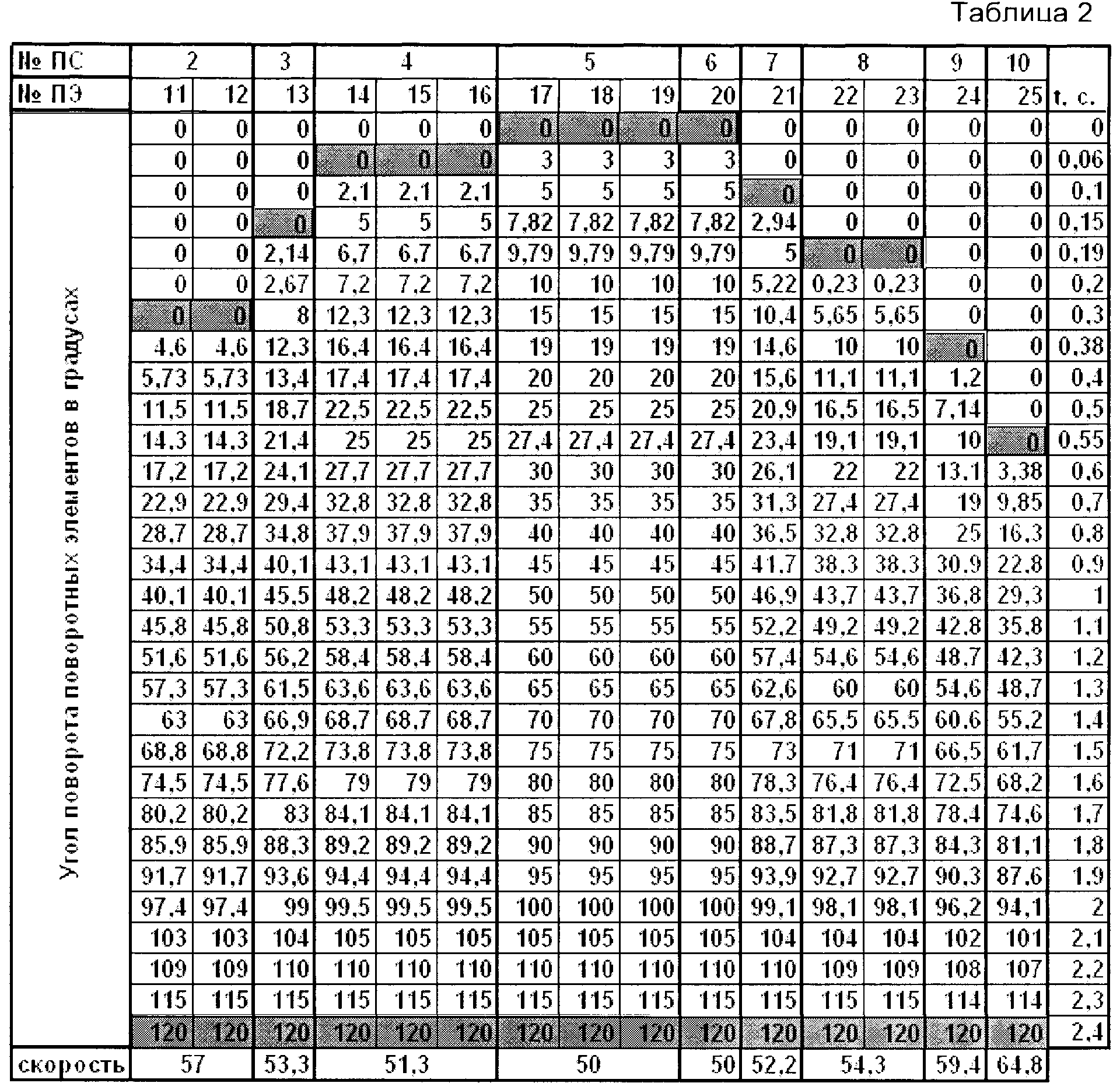 Кроме предлагаемого метода расчета возможно задание конкретных необходимых параметров для осуществления изобретения эмпирически, что легче всего делается для, по существу, прямолинейных участков. Возможно также использовать другой метод, например, при котором номера приводных средств для расчета задаются не последовательно, а произвольным образом, при этом длительность подаваемых управляющих сигналов, скорость вращения поворотных элементов, угол поворота поворотного элемента, связанного с (n-1)-приводным средством на момент подачи сигнала первого типа на n-приводное средство, а также угол поворота поворотного элемента, связанного с (n-1)-приводным средством на момент подачи сигнала второго типа на n-приводное средство для поворотных элементов, связанных с любым n-приводным средством рассчитывают по другим, но более громоздким формулам, с учетом уже ранее рассчитанных значений аналогичных величин.