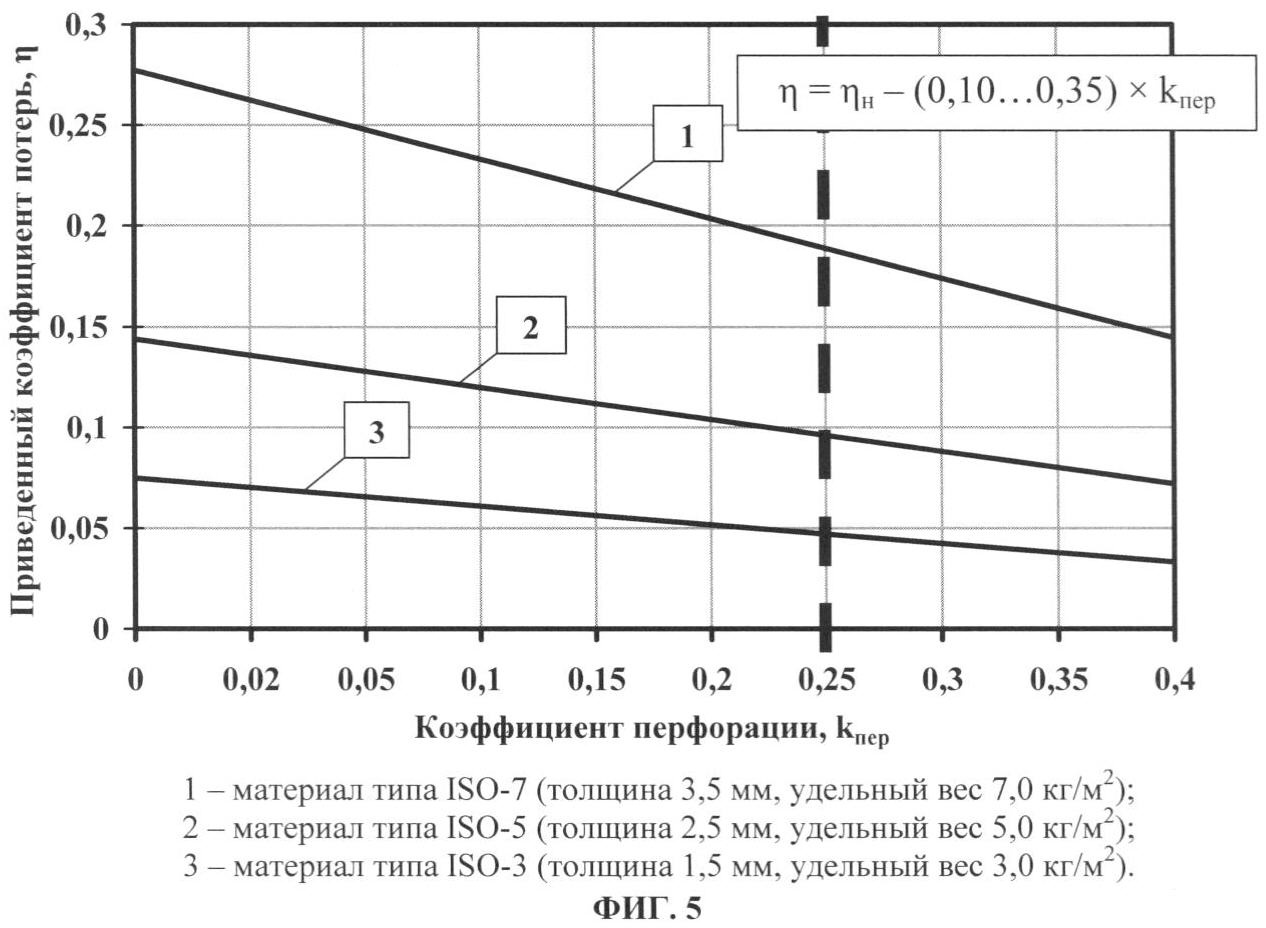 – на фиг.5 представлены экспериментально замеренные зависимости приведенного коэффициента потерь при изменении коэффициента перфорации трех видов материалов виброшумодемпфирующей плосколистовой прокладки типа ISO-3, ISO-5, ISO-7 (вязкоэластичный слой которых выполнен из идентичной битумной композиции), отличающихся между собой только удельным поверхностным весом, соответственно равным 3,0, 5,0 и 7,0 кг/м2 и толщиной вязкоэластичного слоя 1,5, 2,5 и 3,5 мм;
