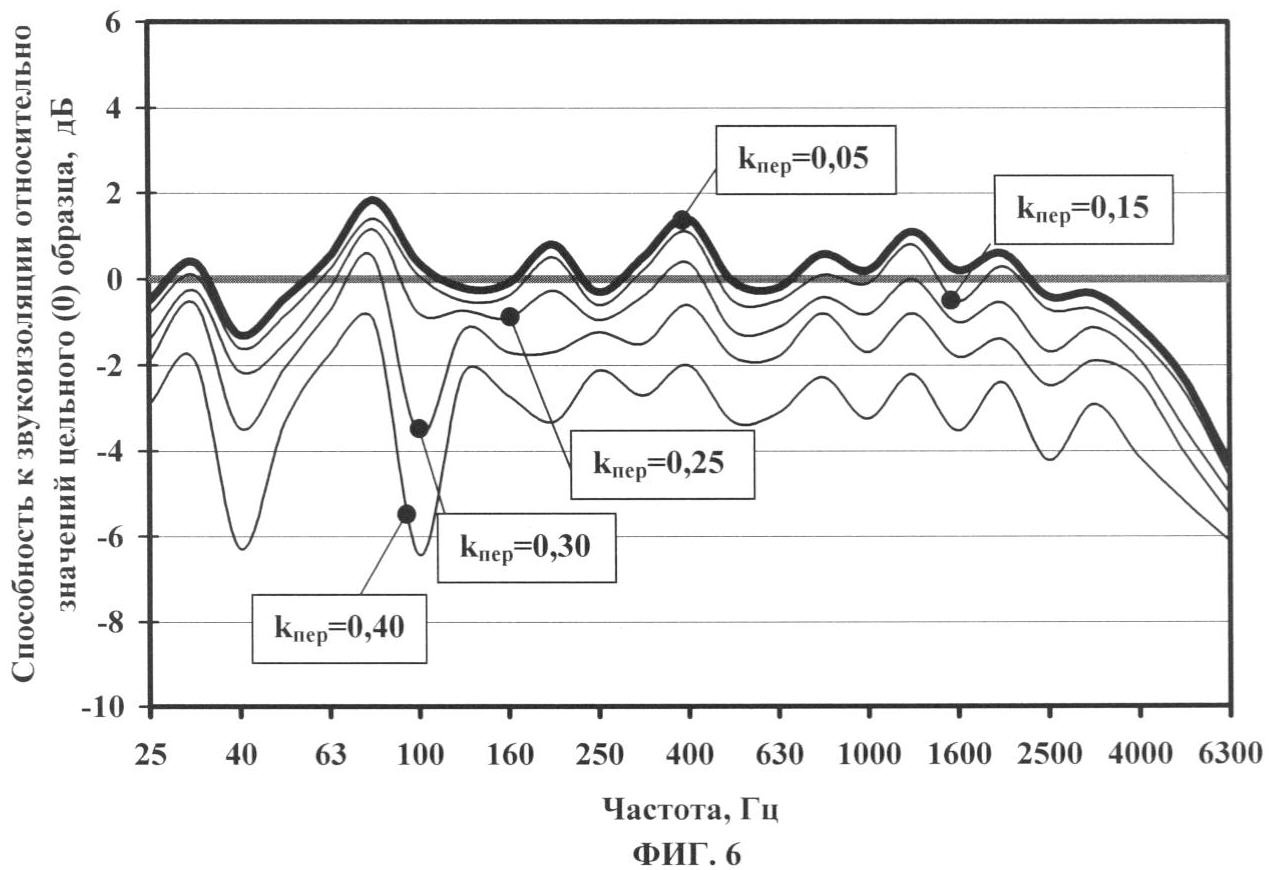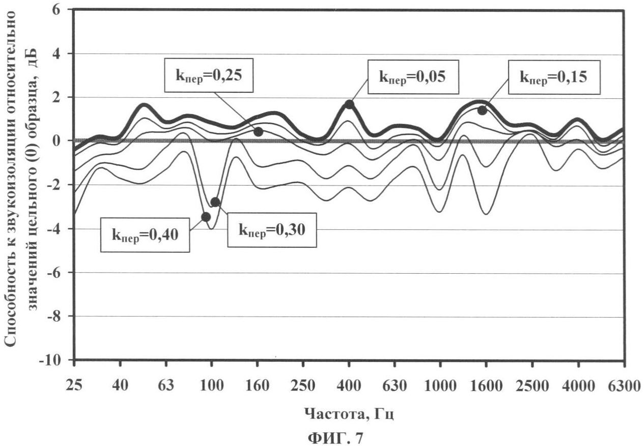 Из результатов экспериментальных исследований параметра «способность к звукоизоляции», представленных на фиг.6, следует, что при величине коэффициента перфорации до kпер=0,25, в частотном диапазоне 25…4000 Гц происходит незначительное снижение параметра «способность к звукоизоляции», не превышающее 2 дБ. В это же время в отдельных частотных диапазонах наблюдается и некоторое увеличение значений параметра «способность к звукоизоляции». В высокочастотном диапазоне 4000…6300 Гц отмечено более значительное снижение параметра «способность к звукоизоляции». При этом такое снижение является не существенным, т.к. основное функциональное предназначение виброшумодемпфирующих плосколистовых прокладок – это обеспечение снижения структурной изгибной вибрации панелей и соответствующего структурного звука на низких частотах (до 500 Гц). Использование виброшумодемпфирующих плосколистовых прокладок с существенно большим коэффициентом перфорации kпер (превышающим kпер=0,25) приводит к снижению параметра «способность к звукоизоляции» уже на низких и средних частотах на величину до 6,3 дБ, что недопустимо. Это и является ограничением верхнего заявляемого предела значения коэффициента перфорации (kпер=0,25).