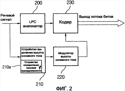 [102] Модулятор 220 высоты основного тона изменяет высоту основного тона входного речевого сигнала, получаемого от устройства выделения высоты основного тона 210 с использованием периода основного тона. Кодер 230 кодирует модулированную речь с помощью переменных, полученных от LPC анализатора 200 и модулятора высоты основного тона 220, и в конце выдает поток битов.