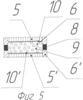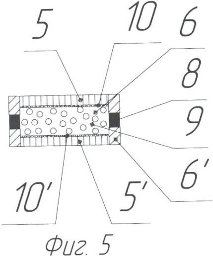 Пленку твердого полимерного электролита 9 шириной, равной 24 мм, что соответствует ширине токосъемного электрода 5, укладывают на токосъемные электроды 5, расположенные в одном вертикальном ряду на форме 1. При этом каталитические слои 10, нанесенные на ТПЭ 9, сопрягают с токосъемным электродом 5. Число укладываемых полос твердого полимерного электролита 9 равно числу вертикальных рядов на форме 1. Затем сверху укладывают вторую алюминиевую форму с токосъемными электродами 5′ и токоотводами 6′. При этом токосъемные электроды 5′ сопрягают с каталитическим слоем 10′ ТПЭ 9. Все электродные слои 5 и 5′ с двух сторон твердого полимерного электролита 9 точно совпадают. Аналогично совпадают и токоотводы 6 и 6′, на поверхности которых нанесена клеевая пленка 8.