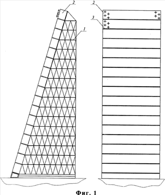 Как видно из представленной на фиг.1 схемы построения заявляемой антенной решетки, она состоит из подмодульных ферм 1 и антенных модулей – фрагментов АР (размером 13,5×2,5 метра) 2, изготовленных на заводе, которые гальванически соединяются между собой проводящими пластинами 3 для образования общего полотна антенны. Для соблюдения точности монтажа модулей в полотно антенны на заводе-изготовителе производят их контрольную сборку следующим образом: