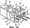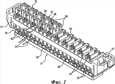 Основание 21 выполнено преимущественно из термопластичного электроизоляционного пластика ПБТ (полибудилентерефталат) с наполнителем из стекловолокна. Обычно на верхней и нижней сторонах основания 21 выполнено несколько отсеков, и внутри основания – множество пазов 25 для установки клемм 30 (см. фиг.1 и 2В). Материал основания обеспечивает превосходную электрическую изоляцию клемм 30 в пазах 25 и обладает достаточной прочностью для удержания проводов и клемм 30. Ячеистая структура предохраняет основание от деформирования и не позволяет ему коробиться в процессе изготовления методом литья. Крышки 18 тоже выполнены из подобного изоляционного материала. Как верхняя, так и нижняя стороны основания 21 снабжены стойками 22 и 24, выемка между которыми помогает удерживать в крышках 18 первый комплект проводов 23 и второй комплект проводов 63. Поэтому размер выемок между стойками 22 и 24 несколько превышает внешний диаметр проводов.