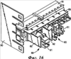 Для обеспечения электрического соединения с заземляющей пластиной (фиг.16) соединительное устройство 16 снабжено заземляющим приспособлением, выполненным преимущественно в виде элемента 89, имеющего форму пластины и вытянутого в длину соединительного устройства. Заземляющая пластина 89 преимущественно соединена с основанием 21, но может также быть закреплена на крышке 18. Заземляющая пластина 89 содержит множество вилочного вида шипов (не показаны), которые расположены в местах, соответствующих заземляющим контактам 85 и 95, с тем, чтобы иметь с ними контакт. Таким образом, когда разъем 80 состыкован с соединительным устройством 16, заземляющие контакты 85 и 95 автоматически соединяются с шипами на заземляющей пластине 89. Заземляющая пластина 89 может быть затем соединена с заземляющей плоской поверхностью любым удобным способом, например, соединена с рамой 90, выступающей наружу (см. фиг.17). Рама затем может быть соединена с заземляющей плоской поверхностью проводами большого сечения (например, типа 6 AWG).