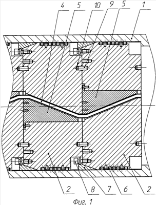 Проходка содержит протяженный корпус 1. Форма корпуса может быть как цилиндрической, так и прямоугольной, в зависимости от конкретных требований. Как следствие, аналогичную форму будут иметь вставки 2, полностью идентичные друг другу. В центральной части каждой вставки 2 выполнен узкий клинообразный сквозной паз 3 (фиг.2), предназначенный для размещения в нем кабеля 4 в защитной оболочке и клинообразного вкладыша 5. На наружной боковой поверхности каждой вставки выполнены шариковые направляющие 6, обеспечивающие удобство перемещения вставок 2 вдоль протяженного корпуса в процессе монтажа. Кроме того, наружная боковая поверхность вставок 2 снабжена фиксирующими элементами, выполненными в виде распорных клиньев 7, приводимых в рабочее состояние винтами 8 после установки вставок 2 в заданное положение. На торцевой поверхности вставок 2 выполнены элементы позиционирования в виде штифтов 9 и встречных отверстий 10.