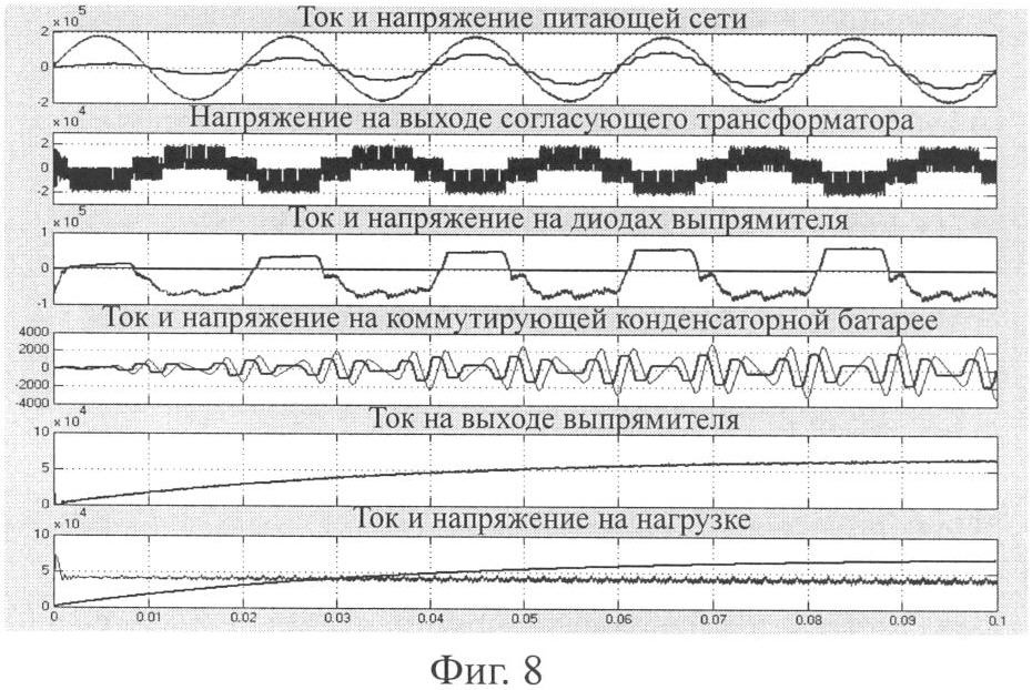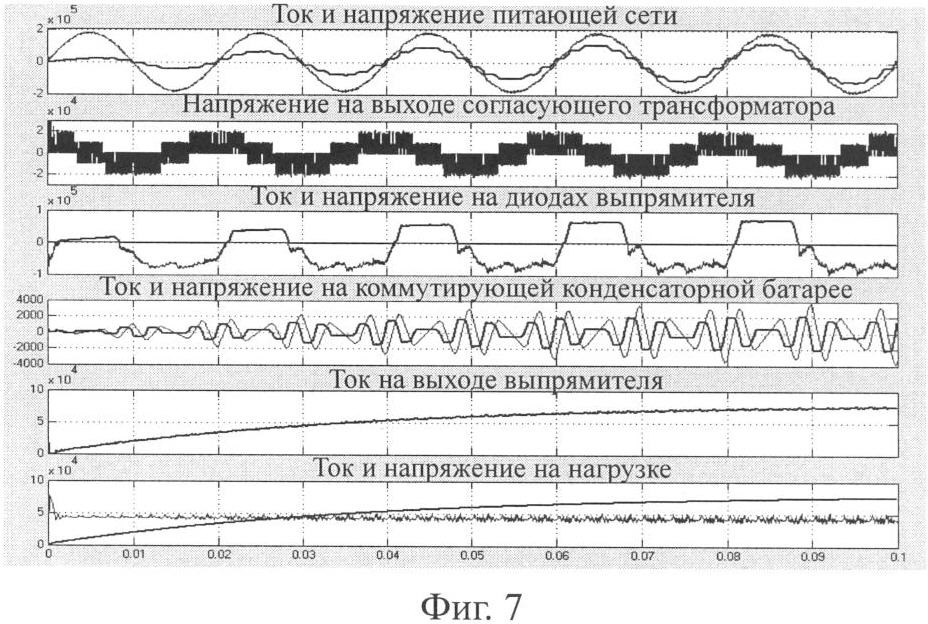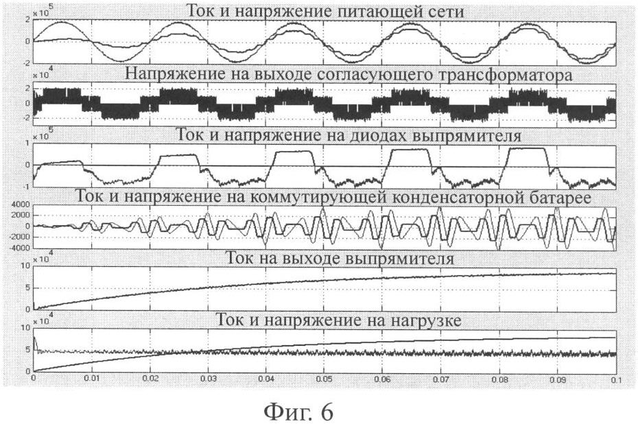 Технико-экономический эффект от предлагаемого способа управления многофазным выпрямительным агрегатом состоит в существенном упрощении выпрямительного агрегата, поскольку теперь силовая часть его выполняется в простейшем диодном варианте без тиристоров или дросселей насыщения. Дополнительно введенные в схему автономный инвертор напряжения с согласующим трансформатором имеют небольшую установленную мощность, определяемую лишь половиной требуемого диапазона регулирования выпрямленного напряжения агрегата из-за возможности изменения фазы выходного напряжения инвертора и соответственно согласующего трансформатора на 180 эл. град. Предлагаемый способ обеспечивает повышение коэффициента мощности выпрямительного агрегата, что снижает потери и повышает качество электрической энергии в питающей сети. Повышение коэффициента мощности имеет место даже при отсутствии компенсирующего устройства, если регулирование напряжения агрегата осуществляется изменением фазы выходного напряжения инвертора и согласующего трансформатора. При этом наибольший коэффициент мощности наблюдается при фазе модулирующего сигнала, равной 90 эл. град. Особенно высокий коэффициент мощности достигается при применении предлагаемого способа в агрегате с компенсирующим устройством, поскольку в этом случае выпрямитель практически не потребляет реактивной мощности. Об этом свидетельствует совпадение по фазе напряжения и тока питающей сети на фиг.6, 7 и 8. Причем в этом случае способ реализуется в агрегате, установленная мощность компенсирующего устройства которого при работе на частотах пятой и седьмой гармоник примерно в шесть раз меньше той мощности, которая потребовалась бы при традиционном включении компенсирующего устройства на частоту питающей сети. Кроме того, при использовании способа в агрегате с компенсирующим устройством и параллельным включением выпрямительных мостов имеет место упрощение агрегата за счет исключения специальных устройств, выравнивающих токи преобразовательных блоков. Наконец, применение способа в агрегатах с компенсирующим устройством повышает жесткость внешней характеристики выпрямителя, что увеличивает выходную мощность агрегата.