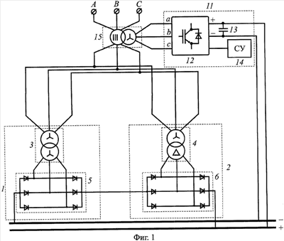 1. Способ управления многофазным выпрямительным агрегатом, по крайней мере, с одной парой шестифазных преобразовательных блоков, включенных по схеме двенадцатифазного преобразования, каждый из которых содержит преобразовательный трансформатор с подключенным к его вентильным обмоткам диодным выпрямительным мостом, выходами постоянного тока связанным с нагрузкой, состоящий в том, что для обеспечения требуемого режима работы потребителя постоянного тока плавно регулируют выпрямленное напряжение, отличающийся тем, что плавное регулирование выпрямленного напряжения агрегата осуществляют изменением выходного напряжения дополнительно введенного трехфазного мостового автономного инвертора напряжения с синусоидальной широтно-импульсной модуляцией, который входными выводами подключают к цепи постоянного тока агрегата, а выходными выводами подключают к первичной обмотке трехфазного согласующего трансформатора, при этом вторичные фазные обмотки согласующего трансформатора подключают пофазно последовательно с сетевыми обмотками преобразовательных трансформаторов.