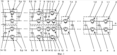 На фиг.1 у первой второй коммутационной группы 5.1 первый 7 и третий 11 управляемые двунаправленные силовые полупроводниковые выключатели соединены с конденсатором 13 первой второй коммутационной группы 5.1. Далее у первой третьей коммутационной группы 6.1 первый 8 и второй 10 управляемые двунаправленные силовые полупроводниковые выключатели соединены с конденсатором 14 первой третьей коммутационной группы 6.1. К тому же у второй второй коммутационной группы до р-й второй коммутационной группы 5.2, …, 5.р и у второй третьей коммутационной группы до р-й третьей коммутационной группы 6.2, …, 6.р соответственно первый и второй управляемые двунаправленные силовые полупроводниковые выключатели 7, 9, 8, 10 соединены с конденсатором 13, 14 соответствующей коммутационной группы 5.2, …, 5.р, 6.2, …,6.р.