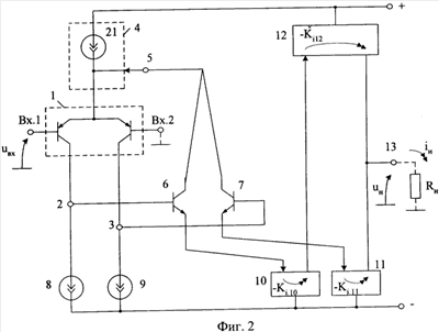 Поставленная цель достигается тем, что в дифференциальном усилителе (фиг.1), содержащем входной дифференциальный каскад 1 с первым 2 и вторым 3 токовыми выходами, цепь стабилизации статического режима 4 в общей эмиттерной цепи входного дифференциального каскада 1, имеющая неинвертирующий вход 5, первый 6 и второй 7 транзисторы цепи обратной связи, первый 8 и второй 9 токостабилизирующие двухполюсники, причем база первого 6 транзистора цепи обратной связи соединена с первым 2 токовым выходом входного дифференциального каскада 1 и первым 8 токостабилизирующим двухполюсником, база второго 7 транзистора цепи обратной связи соединена со вторым 3 токовым выходом входного дифференциального каскада 1 и вторым 9 токостабилизирующим двухполюсником, а коллекторы первого 6 и второго 7 транзисторов цепи обратной связи связаны с неинвертирующим входом 5 цепи стабилизации статического режима 4, предусмотрены новые элементы и связи – в схему введены первое 10, второе 11 и третье 12 токовые зеркала, эмиттер первого 6 транзистора цепи обратной связи соединен со входом первого токового зеркала 10, эмиттер второго 7 транзистора цепи обратной связи соединен со входом второго токового зеркала 11, выход первого 10 токового зеркала соединен со входом третьего токового зеркала 12, выходы второго 11 и третьего 12 токовых зеркал связаны друг с другом и подключены к выходу 13 дифференциального усилителя.