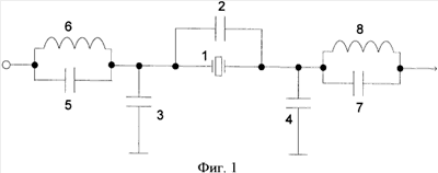 На фиг.1 приведена электрическая схема предлагаемого устройства. Устройство состоит из пьезоэлектрического резонатора 1 с параллельно подключенным конденсатором 2, к первому выводу пьезорезонатора подключен второй конденсатор 3, второй вывод которого соединен с общей шиной, ко второму выводу пьезорезонатора 1 подключен третий конденсатор 4, второй вывод которого подключен к общей шине, четвертый конденсатор 5 и первая катушка индуктивности 6 включены между первым выводом пьезорезонатора и входной потенциальной клеммой фильтра, пятый конденсатор 7 и вторая катушка индуктивности 8 включены между вторым выводом пьезорезонатора и выходной клеммой фильтра.