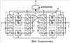 Наиболее близким по совокупности признаков к заявляемому фильтру является многоканальный фильтр на поверхностных акустических волнах (ПАВ) [2] (Фиг.1), имеющий входную 1 и выходную 2 клеммы, входной 3 и выходной 4 коммутаторы, каждый из которых состоит из N по числу каналов фильтра ключей 5 со своими управляющими входами, частотно-избирательный блок 6 с усилителем 7, расположенный между входным 3 и выходным 4 коммутаторами и состоящий из N каналов, каждый из которых содержит входной 8 и выходной 9 фильтры на ПАВ, канальные входной 10 и выходной 11 ключи со своими управляющими входами, причем входная клемма 1 соединена с входами ключей 5 входного коммутатора 3, а выходная клемма 2 соединена с выходами ключей 5 выходного коммутатора 4, вход усилителя 7 соединен с выходами канальных входных ключей 10 электрическими шинами 12 первой группы, а выход усилителя 7 соединен со входами канальных выходных ключей 11 электрическими шинами 13 второй группы, в каждом канале частотно-избирательного блока 6 вход канального входного ключа 10 соединен с выходом входного 8 фильтра на ПАВ, вход которого соединен с выходом соответствующего ключа 5 входного коммутатора 3, выход канального выходного ключа 11 соединен со входом выходного 9 фильтра на ПАВ, выход которого соединен со входом соответствующего ключа 5 выходного коммутатора 4.