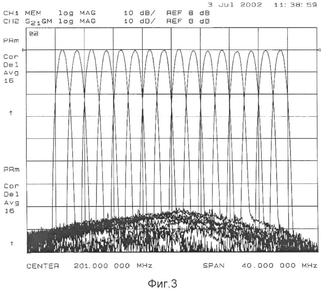 Предлагаемое техническое решение прошло экспериментальную проверку. Многоканальный фильтр перекрывал диапазон частот 186-216 МГц и содержал 16 каналов с фильтрами на ПАВ с относительной шириной полосы пропускания по уровню – 2 дБ около 1,5%. Фильтры на ПАВ выполнены на срезе YX/128°LiNbO3.