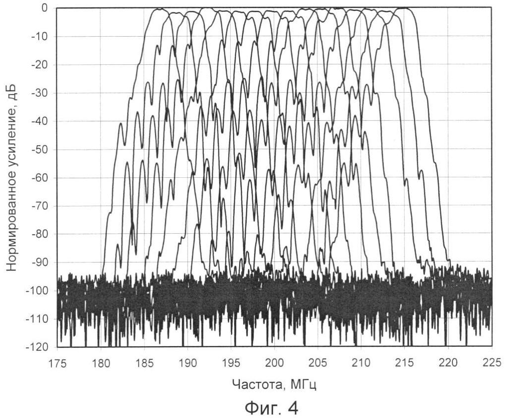 Известное устройство-прототип имело габариты 250×180×17 мм. (Использовалась двухсторонняя печатная плата с 8-ю каналами на каждой стороне.) На Фиг.3 показана нормированная АЧХ известного устройства при включении по порядку всех 16-ти каналов. Диапазон перекрываемых частот 186-216 МГц. На Фиг.4 представлена измеренная нормированная АЧХ предлагаемого многоканального фильтра при включении по порядку всех 16-ти каналов. Как видно из графиков, предложенный фильтр имеет подавление около 90 дБ для всех каналов. Известное устройство имеет наилучшее подавление около 80 дБ для первого канала. По мере увеличения числа каналов и центральных частот фильтров идет ухудшение избирательности (подъем АЧХ) до 70 дБ в центре перекрываемого диапазона. Таким образом, предлагаемый фильтр обладает уменьшенными искажениями АЧХ за счет уменьшения паразитных реактивностей в конструкции.