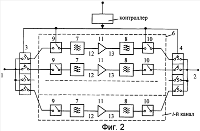 Входной сигнал с входной клеммы 1 через замкнутый соответствующий ключ 5 входного коммутатора 3, замкнутый канальный входной ключ 9 поступает на входной 7 фильтр на ПАВ с центральной частотой fi, где он проходит частотную селекцию и далее через электрическую шину 12 первой группы, усилитель 11, электрическую шину 13 второй группы, выходной 8 фильтр на ПАВ с центральной частотой fi, где он проходит дополнительную частотную селекцию, замкнутый канальный выходной ключ 10, замкнутый соответствующий ключ 5 выходного коммутатора 4 поступает на выходную клемму 2.