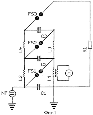 У описанного ниже устройства пробой первого искрового разрядника FS1, изображенного здесь в качестве примера трехступенчатого генератора Маркса, достигается за счет кратковременно приложенного перенапряжения. Представленный здесь генератор Маркса рассчитан на повторяющийся режим работы и снабжен поэтому зарядными катушками L1-L4, которые на фазе зарядки параллельно включают конденсаторы С1-С3 (фиг.1-3). При этом, например, зарядная катушка L1 со стороны Земли дополнена до импульсного трансформатора. Выработанное этим трансформатором напряжение суммируется с зарядным напряжением конденсатора первой ступени и вырабатывает при подходящей полярности перенапряжение на искровом разряднике FS1 этой ступени. Перенапряжение способствует, следовательно, временно и целенаправленно самопробою искрового разрядника FS1.