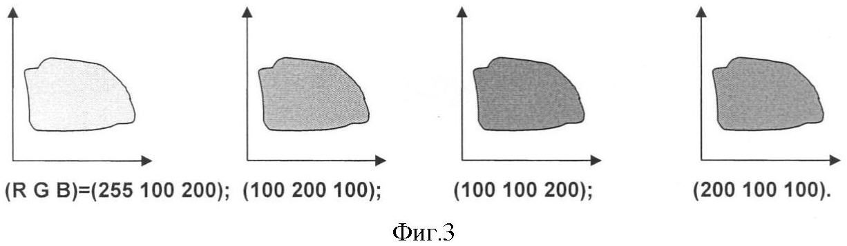 Предлагаемый способ идентификации автора живописного произведения культуры основан на учении Гете о цвете, согласно которому теоретически любой цвет (колер, тон, полутон, яркость) может быть составлен из трех основных цветов: красного, желтого и синего. (Далее везде «основной желтый» заменен на «дополнительный I-степени зеленый», поскольку в ходе изобретения использовался цифровой способ описания цвета в профиле RGB, хотя предлагаемое изобретение с некоторыми изменениями может быть применено с использованием и всех других профилей: CMYK, LAB и т.д.). Исходя из равнобедренности треугольника Гете, в его центре должна находиться идеально серая точка, включающая по черно-белой шкале (1+255)/2=128 (градаций) тонов. [На сегодняшний день в цифровом описании принято, что диапазон изменения цветов лежит в интервале 0-255. Однако «0» вступает в противоречие с учением Гете. Поэтому в качестве нижнего минимального предела шкалы изменения цвета R, G и В автор принял (111), а для черно-белой шкалы соответственно – «1»]. Тогда ее совокупная спектральная плотность в профиле RGB по цветной шкале (в центре треугольника) будет соответственно равна (128+128+128)/3=128 тонов (градаций). Каждый тон шифруется своим кодом. Отсюда следует, что, теоретически, спектр любого колера на языке общепринятого цифрового (матричного) описания цвета в профиле RGB может быть представлена как средняя арифметическая сумма составляющих его цветов: (R+G+B)/3. Далее, если в профиле RGB по аналогии с музыкальной грамотой расписать колер как обертон (основополагающая тон), сочетающийся с первым и вторым тонами, то легко заметить, что вклад двух последних в результирующий тон колера заключается в гашении основного тона, поскольку яркость колера всегда будет ниже яркости обертона. Поэтому, в случае красных, желтых, коричневых и т.д. тонов, для которых в качестве обертона выступает Rс, цвет может быть описан уравнением: Rc>(R+G+B)/3, – (ур.1). Для зеленых – Gc>(R+G+B)/3 и, наконец, для синих – Bc>(R+G+B)/3. Все эти неравенства превратятся в тождества, если учесть в них коэффициент гашения обертона: kг. Т.е. в случае красных, желтых и других тонов, у которых в качестве обертона выступает R, уравнение приобретет вид: Rc=kг[(R+G+B)/3]; для зеленых – Gc=kг[(R+G+B)/3] и, наконец, для синих – Bc=kг[(R+G+B)/3]. (Согласно исследованиям, проведенным цветопсихологами, красный цвет оказывает на психику человека возбуждающее действие. Мозг последнего, в свою очередь, стремиться погасить агрессию R посредством подстановки к нему успокаивающих зеленого или сине-зеленого, поэтому автор в качестве обертона предложил рассматривать «Rc» – суммарная величина колера независимо от цвета колера).