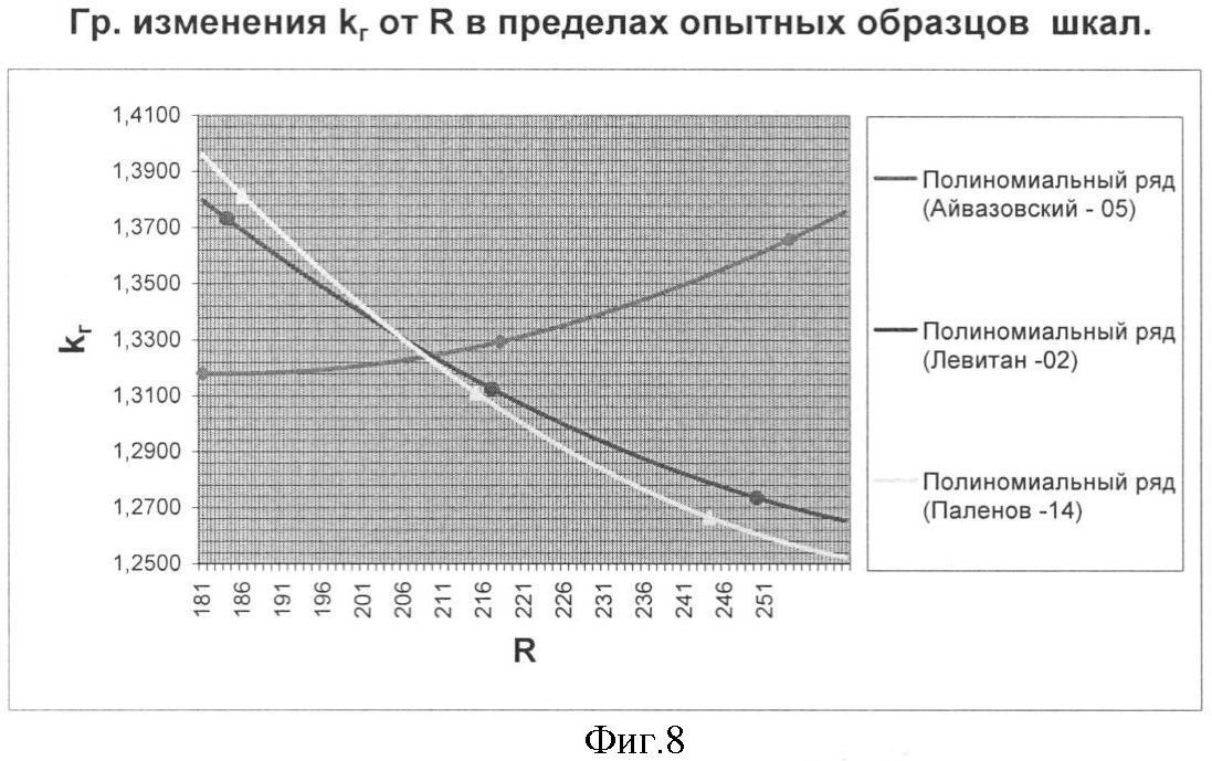 На основании вышесказанного, автор изобретения считает необходимым использование графического сопоставления результатов по трем kг: самого темного, самого светлого и промежуточного (срединного) колеров. Из графиков, приведенных в Приложении (не публикуется) очень хорошо видны ошибки, к которым неминуемо придет эксперт, вследствие неучета им естественных погрешностей (например, картины «05» и «08» не принадлежат одному и тому же мастеру!).