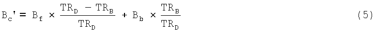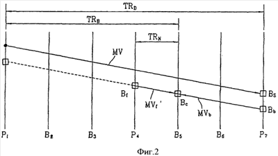 Как показано на фиг.3, если вектор движения вперед режима прямого предсказания получают с использованием известных средств, блок с компенсацией движения Bf находится в предыдущем опорном кадре для режима прямого предсказания (Р1), а блок с компенсацией движения Вb находится в последующем опорном кадре для режима прямого предсказания (Р7), то осуществляют интерполяционное предсказание по уравнению (5). В данном случае TRD – временной интервал между предыдущим опорным кадром для режима прямого предсказания (Р1) и последующим опорным кадром для режима прямого предсказания (Р7), а TRB – временной интервал между предыдущим опорным кадром для режима прямого предсказания (Р1) и текущим В-кадром (В5). В частности, способ интерполяционного предсказания включает в себя те же усредняющие вычисления, что и известные средства на тот случай, если В-кадр расположен в центре между предыдущим опорным кадром для режима прямого предсказания и последующим опорным кадром для режима прямого предсказания
