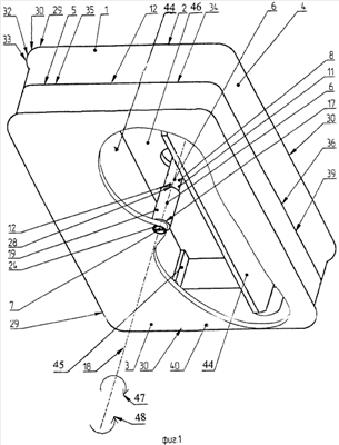 Разборку осуществляют путем поворачивания винта 24 (фиг.1, 2, 3) против часовой стрелки 48 (фиг.1, 2), при этом шайба 26 (фиг.3) упирается во внутреннюю поверхность 25 передней панели 3 (фиг.1, 2, 3), осуществляя расфиксацию втулки 8 и гнезда 21 (фиг.3) цилиндра 19 (фиг.1, 2, 3) и далее разборку корпуса 1 (фиг.1, 2, 3, 5) радиоэлектронного прибора.