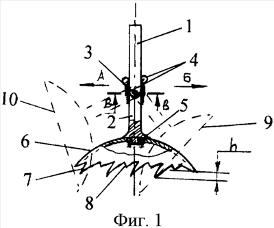 Рассмотрим работу лапы. Во время движения лапы, которое может осуществляться или по направлению стрелки А или стрелки Б, что дает еще одно технологическое преимущество данной лапы, которая может использоваться на мостовых агрегатах, диск 6 движется на заданной глубине, осуществляя обработку почвы, причем зубья 7 и 8, находящиеся на разной глубине, обрабатывают почву на двух уровнях – высота h, что позволяет более интенсивно обрабатывать почву, что дает еще одно технологическое преимущество данной лапы. При встрече со скрытым камнем произойдет отклонение диска в ту или другую сторону в зависимости от выбранного направления: позициями 9 и 10 отмечено возможное отклонение рабочего органа при обходе скрытого камня. При этом пружины 4 упруго сопротивляются отклонению диска, но предотвращают поломку, что сохраняет рабочий орган в целости, а после преодоления препятствия пружины возвращают рабочий орган в вертикальное положение. Следует отметить и то, что при движении в почве возможно вращение диска 6 на нижней части 2 стойки в горизонтальной плоскости, что дополнительно интенсифицирует процесс обработки.