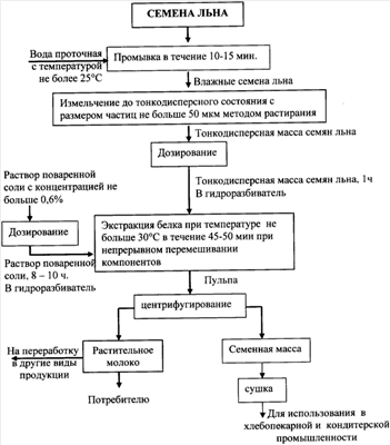 Пульпу, образовавшуюся в результате непрерывного перемешивания исходного измельченного сырья в экстрагирующем водосолевом растворе, разделяют центрифугированием на растительное молоко и семенную массу. Растительное молоко из семян льна можно употреблять в пищу непосредственно или направлять на дальнейшую переработку в качестве исходного сырья или компонента.