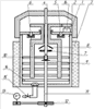 Следующая операция – это сбивание масла. Температура сливок при этом должна быть не выше 14°С. На обрабатываемый продукт воздействуют механически вращающими лопастями 6 и дополнительно синхронно и синфазно ультразвуковыми (УЗ) и сверхвысокочастотными (СВЧ) колебаниями для чего лопасти 6 сделаны из набора пластин полупроводникового материала с экранами, причем пластины собраны в виде стержней и электрически соединены по схеме диодов Ганна. Генерируемые колебания мягко воздействуют на жировые шарики, разрушая только белковую оболочку оставляют жировой шарик в целости. Синхронное и синфазное воздействие СВЧ- и УЗ-колебаниями на обрабатываемый продукт позволило снизить число оборотов со 150-170 до 8-10 об/мин, что значительно повышает качество масла и позволяет снизить энергозатраты. После этой операции осуществляют слив пахты.