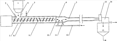 Сырье из бункера 1 загружают непрерывно дозировано в экструдер 2 при помощи средства 6, а по патрубку 7 подают воду для увлажнения сырья. Массу в корпусе экструдера подвергают термомеханической обработке при температуре 120-180°С под давлением 3-12·106 Па в течение 20-50 с с помощью вращающегося шнека и нагревательной системы экструдера. Масса шнеком 8 продвигается к матрице 10 и продавливается через фильеру, при этом дополнительные реверсивные элементы 9 активно перемешивают массу, обеспечивая ее хорошее прогревание. Поступающий из фильеры горячий высокопористый экструдат в смесительной камере 4 экстрактора 3 непрерывного действия под действием струй горячей воды, под давлением выбрасываемых оппозитно установленными форсунками 11, размывается и смешивается с водой в соотношении 1:3-1:4. Процесс экстракции осуществляется по мере течения по трубе экстрактора при температуре 90°С и давлении 0,1-0,2·106 Па в течение 10-12 мин. Температура воды в экстракторе поддерживается специальной нагревательной системой, а продолжительность процесса экстракции регулируется заслонкой 13. Далее экстракт отделяется от шлама фильтром 14 и поступает в емкость 15.