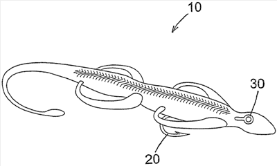 В других конкретных вариантах выполнения биоразлагаемый материал по изобретению содержит смесь сахарозы, желатина, альгината натрия, хлорида кальция, крахмала, метафосфата натрия, кукурузного сиропа, глицерина и пищевого красителя. В дальнейших предпочтительных вариантах данный материал дополнительно содержит рыбный ароматический аттрактант. В другом варианте и со ссылкой на чертеж настоящее изобретение представляет собой рыболовную приманку 10, выполненную из одного или нескольких биоразлагаемых материалов, описанных здесь. Приманке 10 предпочтительно придана форма природного источника корма данного вида рыбы. Например, в показанном варианте приманке 10 придана форма ящерицы. Альтернативные варианты имеют форму червей, лангустов, живцов (рыбок), лягушек, икринок или других животных или растительных материалов. Приманка 10 предпочтительно включает или принимает один или несколько рыболовных крючков 20, предпочтительно содержащих зазубренный конец для сопротивления высвобождению попавшей на крючок рыбы. Приманка 10 и/или крючок 20 предпочтительно содержат ушко 30 или другой соединительный элемент для закрепления приманки/крючка на поводке или на рыболовной леске.