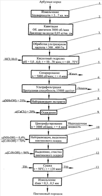 По истечении времени процесса кислотного гидролиза проводится сепарирование 5 (Пр. установка СОС-501Т-2) и ультрафильтрационная очистка гидролизата 6. Процесс ультрафильтрации ведется с использованием мембран пропускной способностью 15000 дал/сут. Полученный пектиновый экстракт нейтрализуется 7 до рН 6,5…7. Для нейтрализации используется 25% раствор аммиака. Нейтрализованный пектиновый экстракт осаждается 8. Осаждение проводят 20%-ым раствором хлористого кальция. Соотношение коагулянта, например, для первой и второй стадии 1:5. Полученный осадок центрифугировали 9 и нейтрализовали 10 двукратной промывкой коагулята спиртовой смесью аммония (NH4OH – 0,4% р-р, С2Н5ОН – 80% р-р), для второй промывки 11 использовали С2Н5ОН – 96% р-р. Полученный продукт представляет собой коагулят, который сушат 12 в сушильном шкафу ШС1. Применение данного вида сушки наиболее оптимально, поскольку пектин относится к термочувствительному материалу. При воздействии высоких температур получаемый продукт утрачивает желирующую способность. Это происходит из-за деструкции пектиновых веществ, которая происходит как в результате распада хелатных связей между ионизированными остатками галактуроновой кислоты в молекуле рамногалактуронана, так и вследствие распада водородных связей между метоксилированными остатками галактуроновой кислоты в соседних молекулах рамногалактуронана. В связи с этим сушка осуществляется при t=50°C в течение 2 часов, что позволяет получить полностью высушенный продукт. Измельчение продукта 13 до порошкообразного состояния производится на микромельнице типа 13-310.