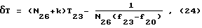 Величина погрешности измерения положения вала двигателя 1 и его угловой скорости может быть оценена, исходя из следующих соображений. Погрешность определения положения импульса делителя 26 возникает из-за дискретности его формирования. Ее величина определяется разностью периода этой частоты и его идеального значения, определяемого из (12). Разность этих величин находится из следующего выражения![]() где k – целое число импульсов датчика 20 за время Т26. Величина T, отнесенная к периоду идеального значения преобразованной частоты фотоимпульсного датчика, соответствующей определенному значению угла поворота вала двигателя 1, является относительной погрешностью ![]() преобразования его текущего положения, которая находится по выражению вида![]() Максимальное значение ![]() , найденное по (25), не превышает N26-1.