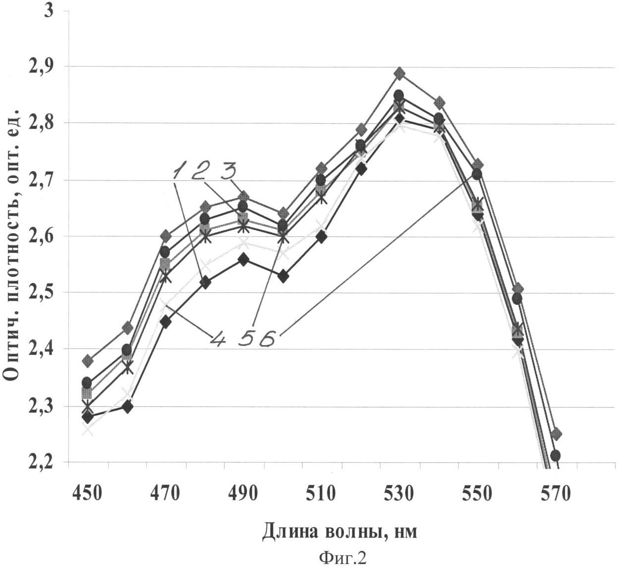 Влияние вишневой мезги на сохранность красящих веществ в разработанном продукте представлено на фигуре 2, где цифрами обозначены графические зависимости оптической плотности от длины волны соков, полученных по способу: 1 – пример 1; 2 – пример 2; 3 – пример 3; 4 – пример 4; 5 – пример 5; 6 – пример 6.