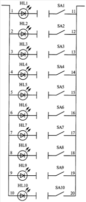 На чертеже представлена схема, содержащая 10 светодиодов HL1-HL10 и соответствующих им 10 кнопок SA1-SA10.