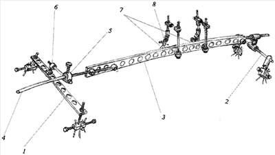 Вначале устанавливается аппарат 1 внешней фиксации повреждений тазового кольца, затем устанавливается аппарат 2 внешней фиксации повреждений ключицы по известным методикам. Следующим этапом оба аппарата монтируются между собой следующим образом: устанавливается соединительный стержень 3 с закрепленным на его конце телескопическим стержнем 4. Гладкая часть телескопического стержня 4 проводится через гладкое отверстие репонирующего блока 5. Репонирующий блок 5 с помощью кронштейна 6 устанавливается на аппарате 1 внешней фиксации повреждений тазового кольца. Соединительный стержень 3 жестко крепится к аппарату 2 внешней фиксации повреждений ключицы при помощи кронштейна. Далее в костные части поврежденных сегментов костного каркаса груди вводятся пучки расходящихся спиц 7. Крепежные концы спиц 7 с помощью демпферов 8 монтируются к соединительному стержню 3 аппарата.