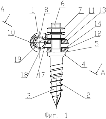 Еще одним средством является сферический шарнир между головкой элемента крепления и деталью связи со стержнем, например, как в конструкциях по заявкам WO №91/06254, МПК А61В 17/60 от 16.05.91 или WO №9855038, МПК А61В 17/70 от 03.06.98. Такие конструкции менее громоздки, но также неудобны при установке.