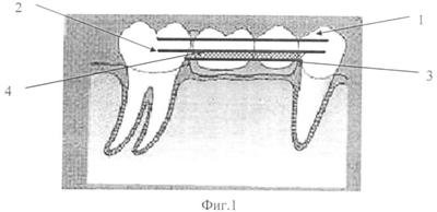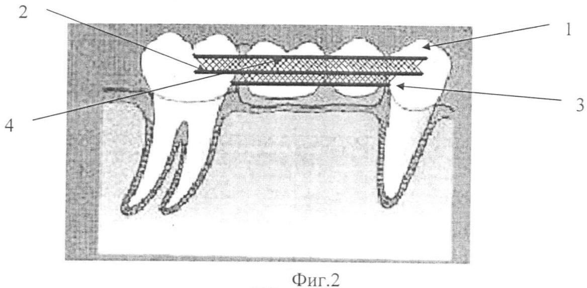 Сущность заявляемого изобретения поясняется графическим изображением, где на фиг.1 представлен мостовидный протез с сеткой на двух балках, на фиг.2 – с сеткой на трех балках.